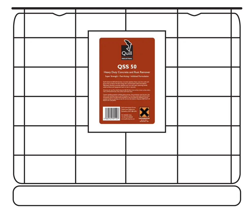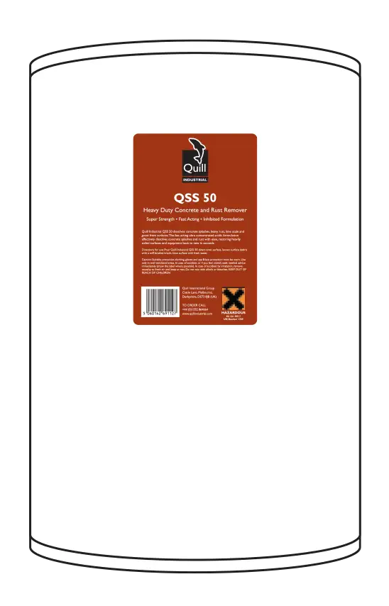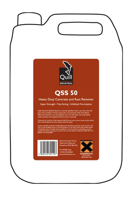 Quill Industrial QSS 50 dissolves concrete splashes, heavy rust, lime scale and grout from surfaces. The fast acting ultra concentrated acidic formulation effectively dissolves concrete splashes and rust with ease, restoring heavily soiled surfaces and equipment back to new in seconds.