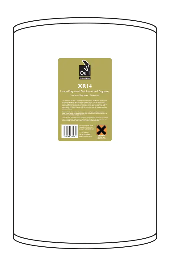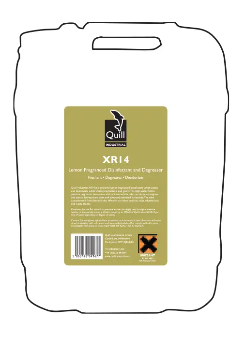 Quill Industrial XR14 is a powerful lemon fragranced disinfectant which cleans and deodorises whilst destroying bacteria and germs. The high performance solution degreases, deodorises and sanitises vehicle cabs, curtain sides, engines and chassis leaving them clean and spotlessly sanitised in seconds. The ultra concentrated formulation is also effective on refuse vehicles, skips, wheelie bins and waste chutes.