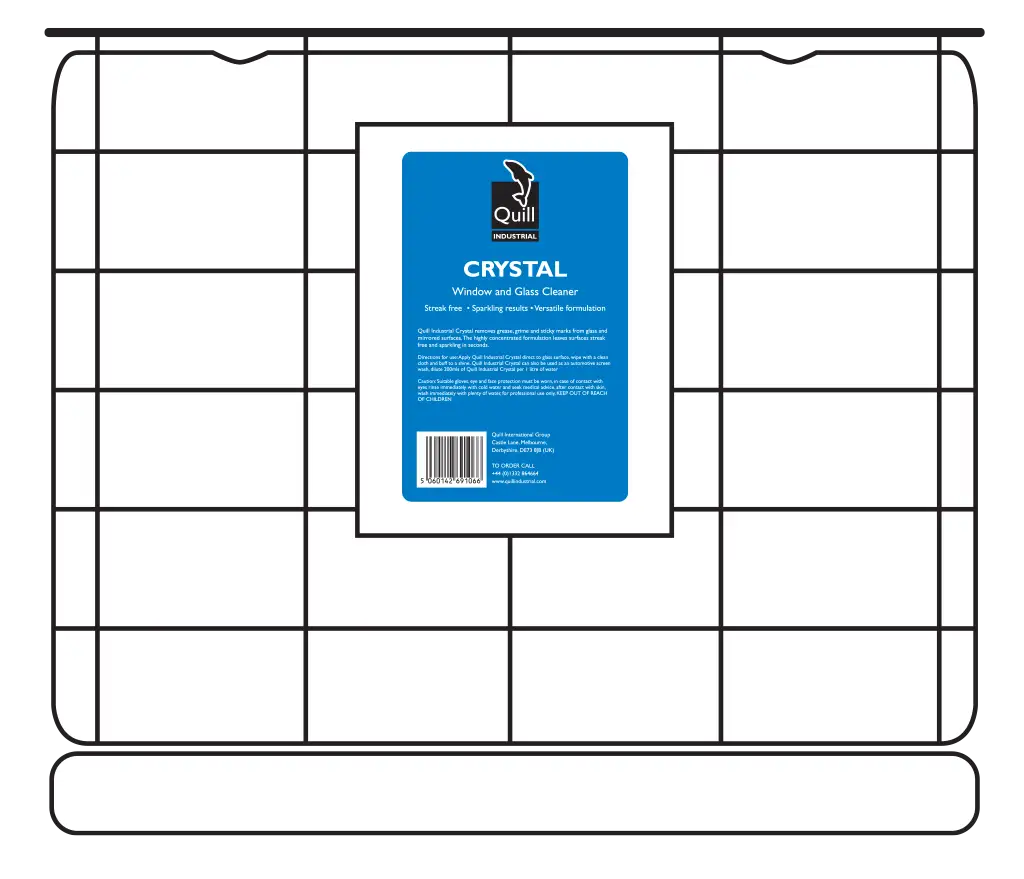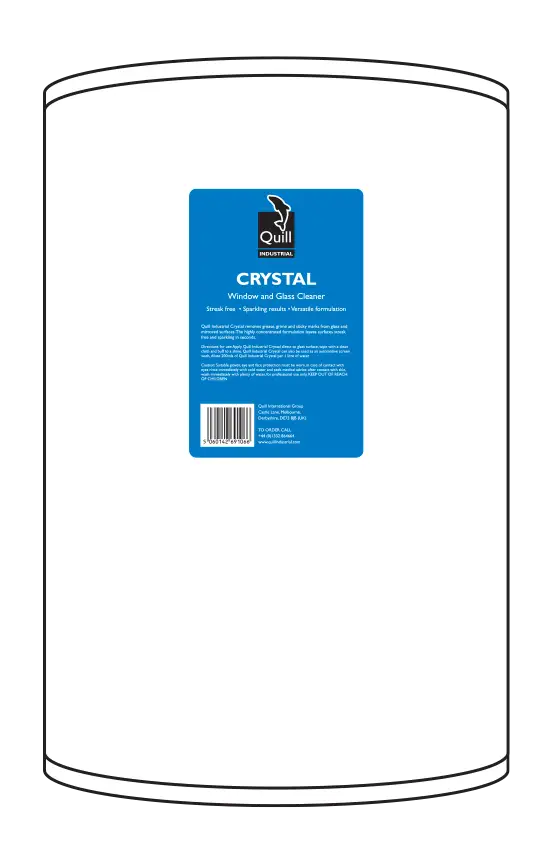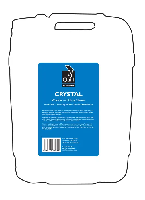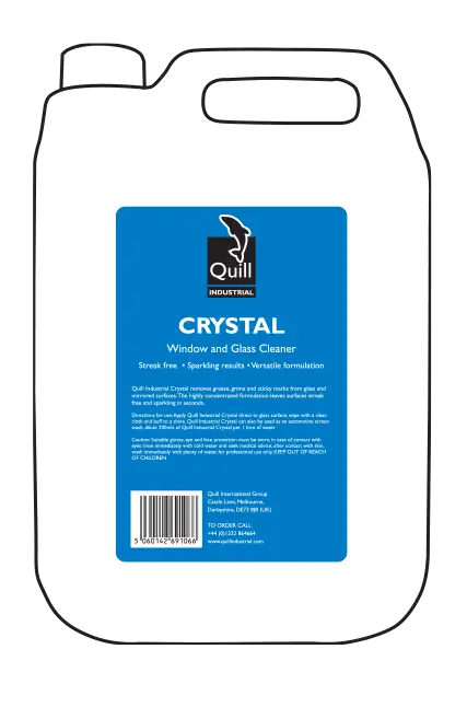 Quill Industrial Crystal removes grease, grime and sticky marks from glass and mirrored surfaces. The highly concentrated formulation leaves surfaces streak free and sparkling in seconds.
