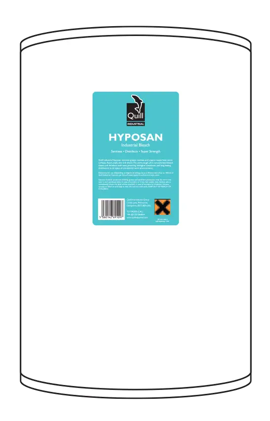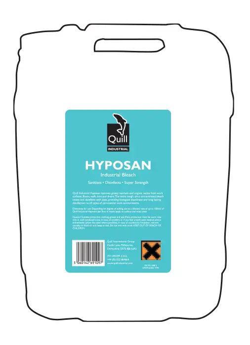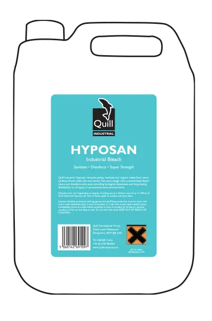 Quill Industrial Hyposan removes greasy residues and organic waste from work surfaces, floors, walls, bins and drains. The extra tough, ultra concentrated bleach cleans and disinfects with ease, providing biological cleanliness and long lasting disinfection to all types of commercial work environments.