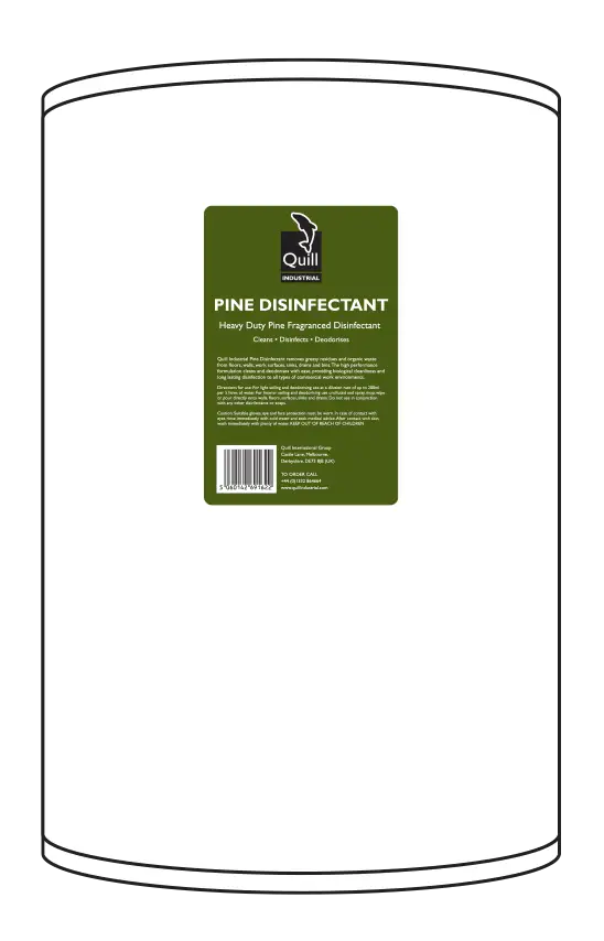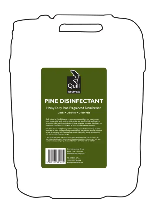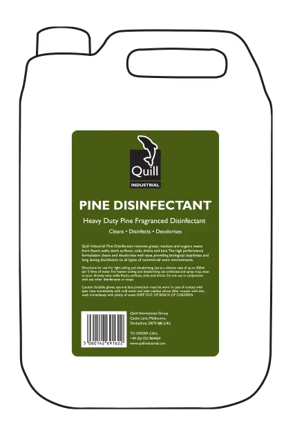 Quill Industrial Pine Disinfectant removes greasy residues and organic waste from floors, walls, work surfaces, sinks, drains and bins. The high performance formulation cleans and deodorises with ease, providing biological cleanliness and long lasting disinfection to all types of commercial work environments.
