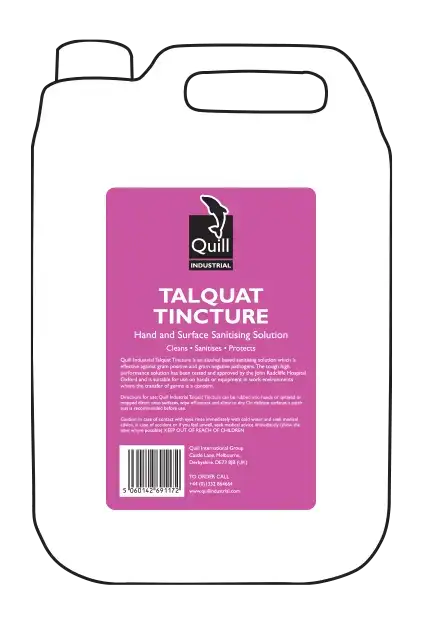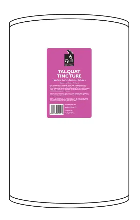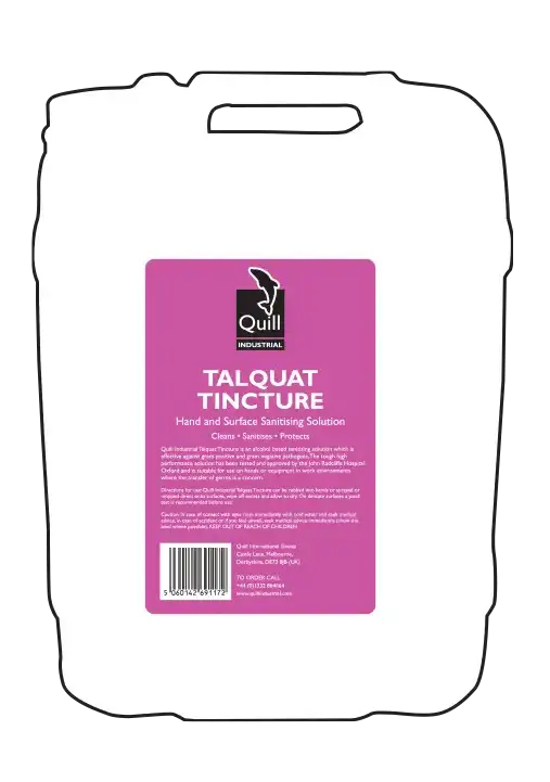 Quill Industrial Talquat Tincture is an alcohol based sanitising solution which is effective against gram positive and gram negative pathogens. The tough high performance formulation is suitable for use on hands or equipment in work environments where the transfer of germs is a concern.