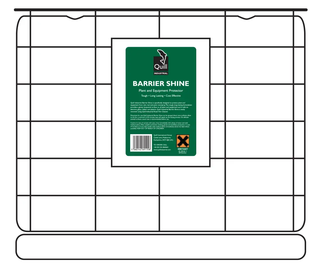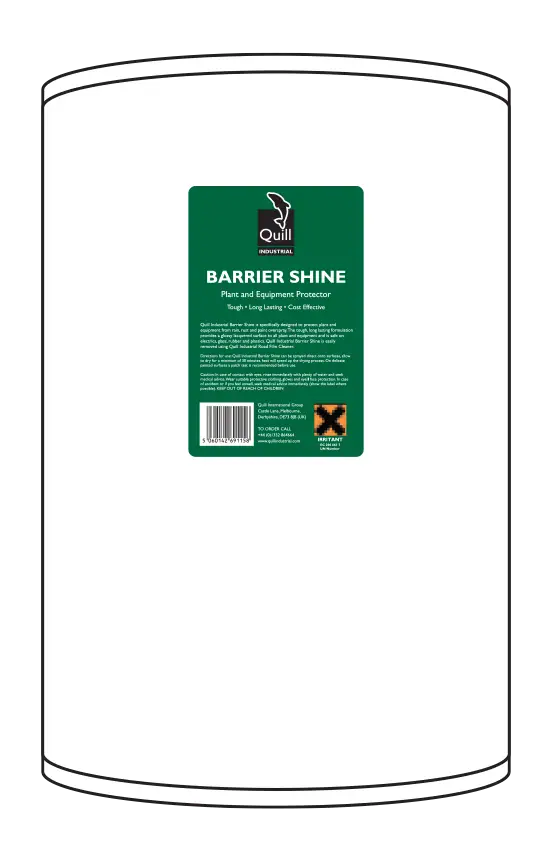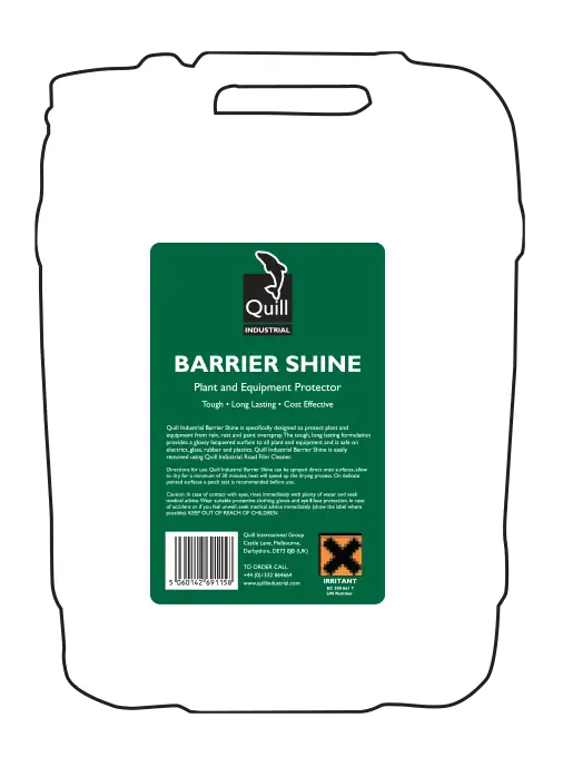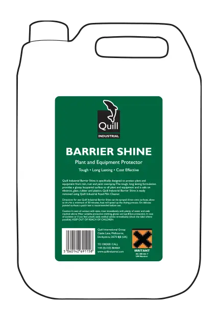 Quill Industrial Barrier Shine is specifically designed to protect plant and equipment from rain, rust and paint overspray. The tough, long lasting formulation provides a glossy lacquered surface to all plant and equipment and is safe on electrics, glass, rubber and plastics. Quill Industrial Barrier Shine is easily removed using Quill Industrial Road Film Cleaner.