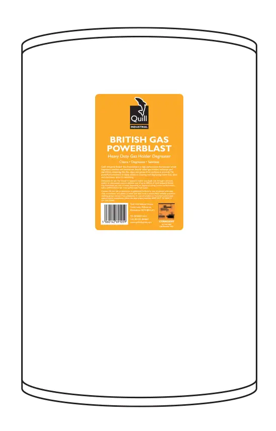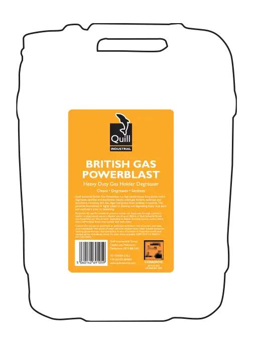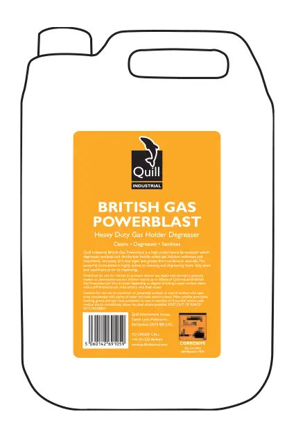Quill Industrial British Gas Powerblast is a high performance formulation which degreases, sanitises and deodorises heavily soiled gas holders, walkways and stanchions, removing dirt, fats, algae and grease from surfaces in seconds. The powerful formulation is highly suited to cleaning and degreasing heavy duty plant and machinery prior to repainting.